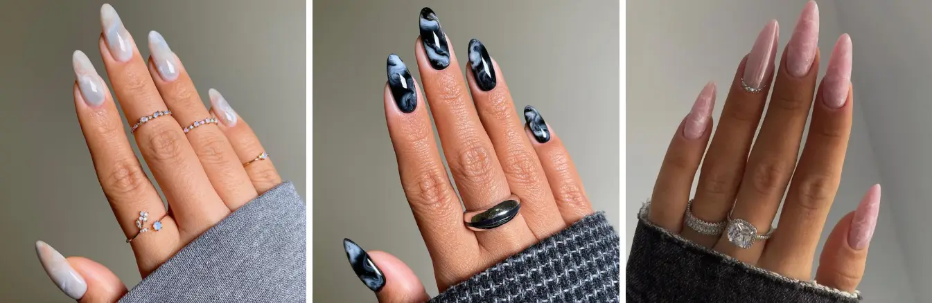 Те, що повторює природні мотиви, завжди виглядає дорого, і мармуровий манікюр (це імітація природного каменю) — не виняток. Але тут є нюанси. Для виконання такого дизайну варто підбирати відтінки одного кольору і стежити, щоб вони не були занадто контрастними. Саме так можна досягти натурального ефекту. І варто пам’ятати, що такий дизайн не потребує додаткового декору — текстура сама по собі є окрасою.