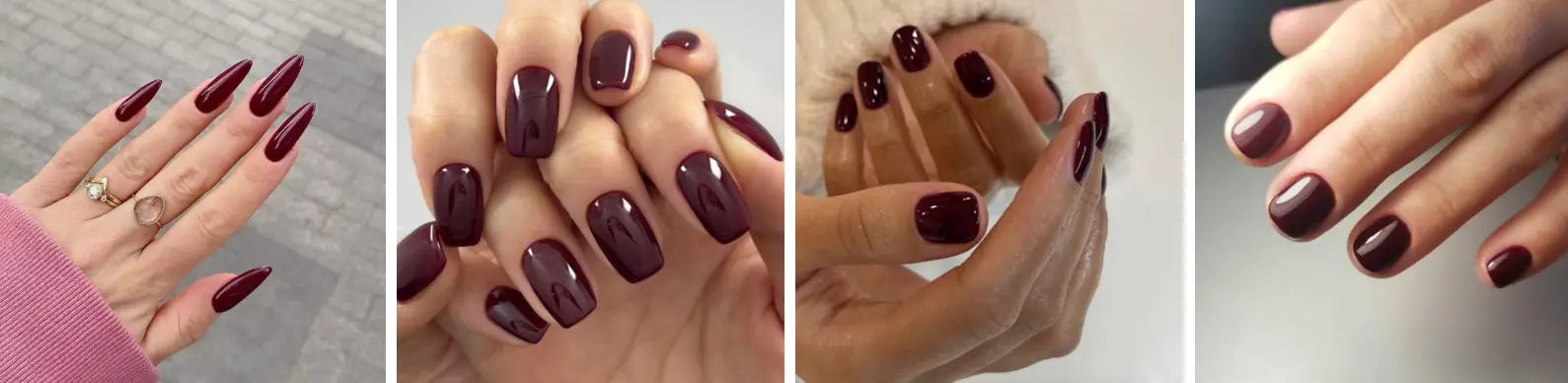 Дизайн із використанням глибоких відтінків бордового кольору — манікюр, який виглядає дорого, особливо якщо завершити його глянцевим або шимерним топом. Таке покриття виграшно виглядає на коротких, середніх та довгих нігтях, головне, щоб їхня форма була ідеальна. Щоб підсилити ефект, можна додати до бордового покриття золоті акценти — тонку смужку чи крапку на одному нігті.