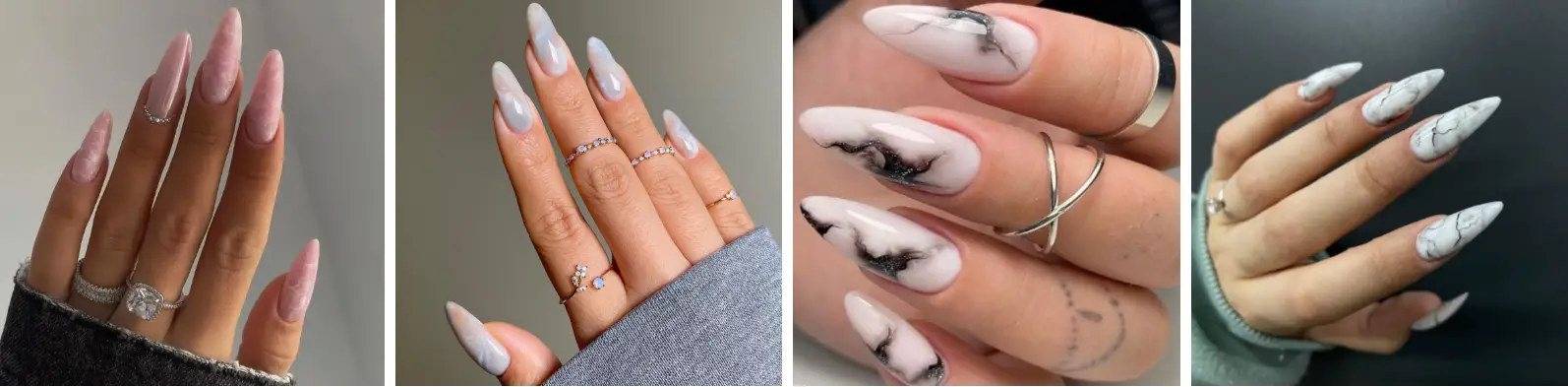 Мраморный маникюр — это элегантный дизайн, вдохновленный природой. Он имитирует на ногтях текстуру натурального камня с характерными прожилками. В этом сезоне актуальны молочные, серые и черные оттенки с золотыми или белыми акцентами. Техника подходит для любой длины ногтей и выглядит стильно в матовом или глянцевом финише.