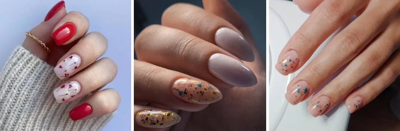 Маникюр с сухоцветами — отличный вариант для тех, кто любит природные мотивы. Настоящие высушенные цветы закрепляют под прозрачным гелем, создавая объемный эффект. Такой дизайн отлично смотрится на длинных ногтях.